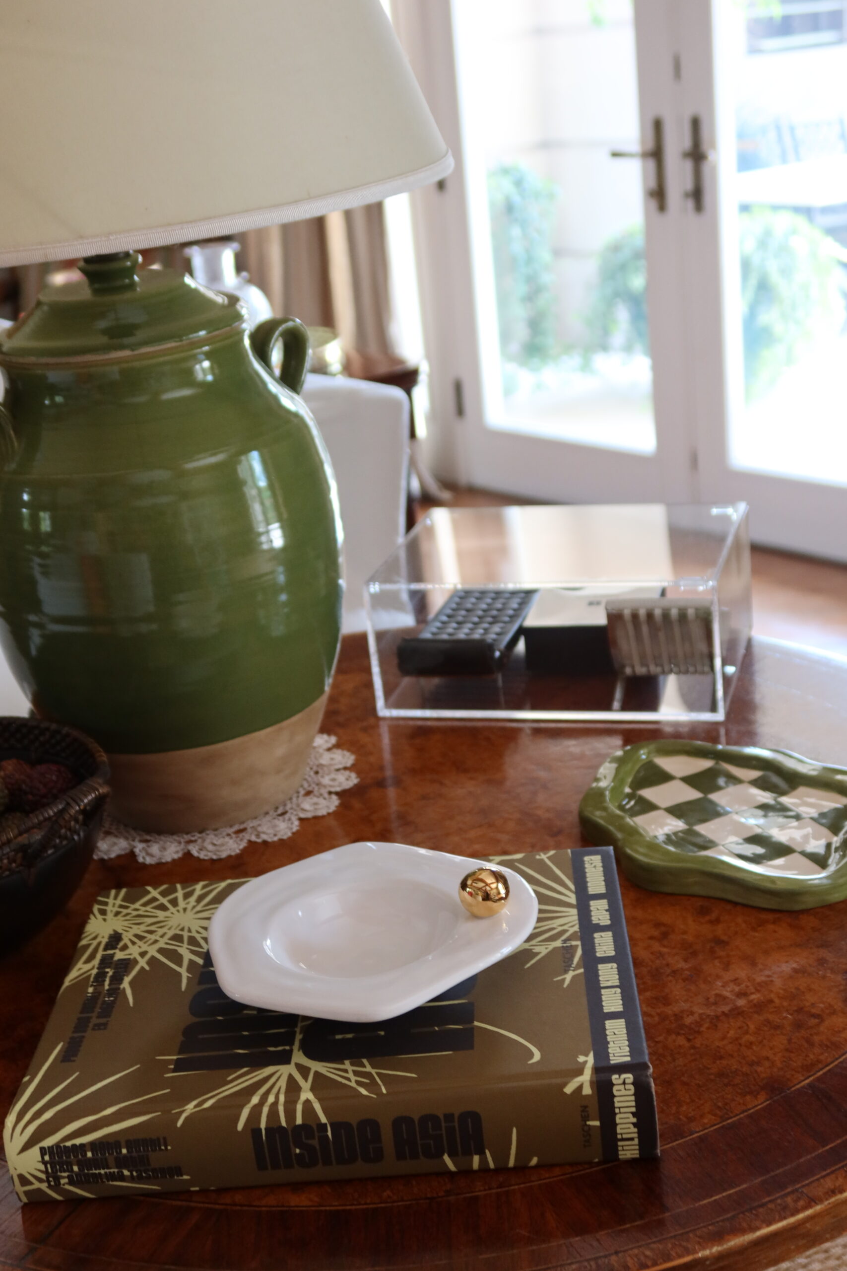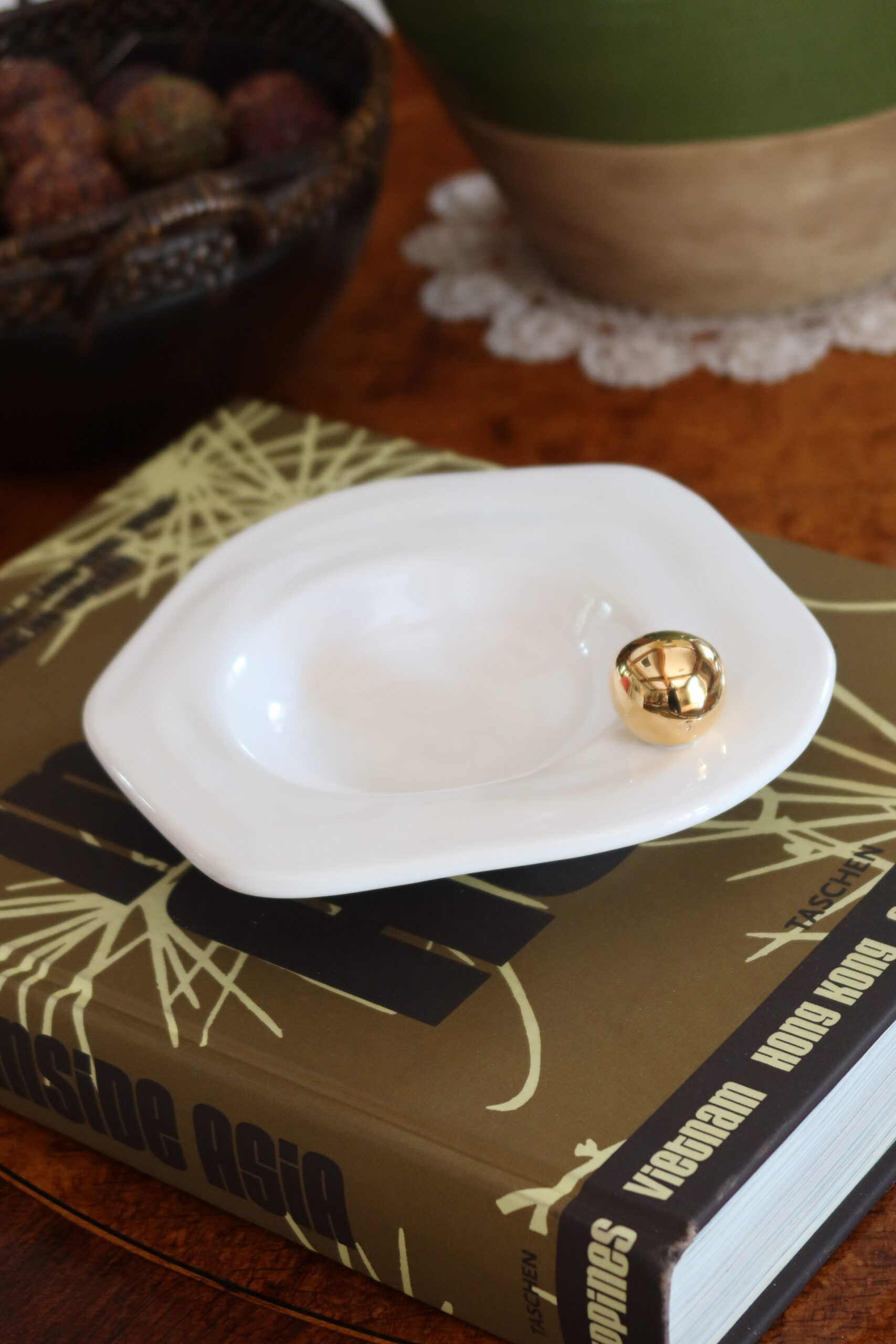 Apoio em formato orgânico com bola moldada à mão em ouro líquido. Pode ser usado como decor, cinzeiro ou para aperitivos!