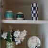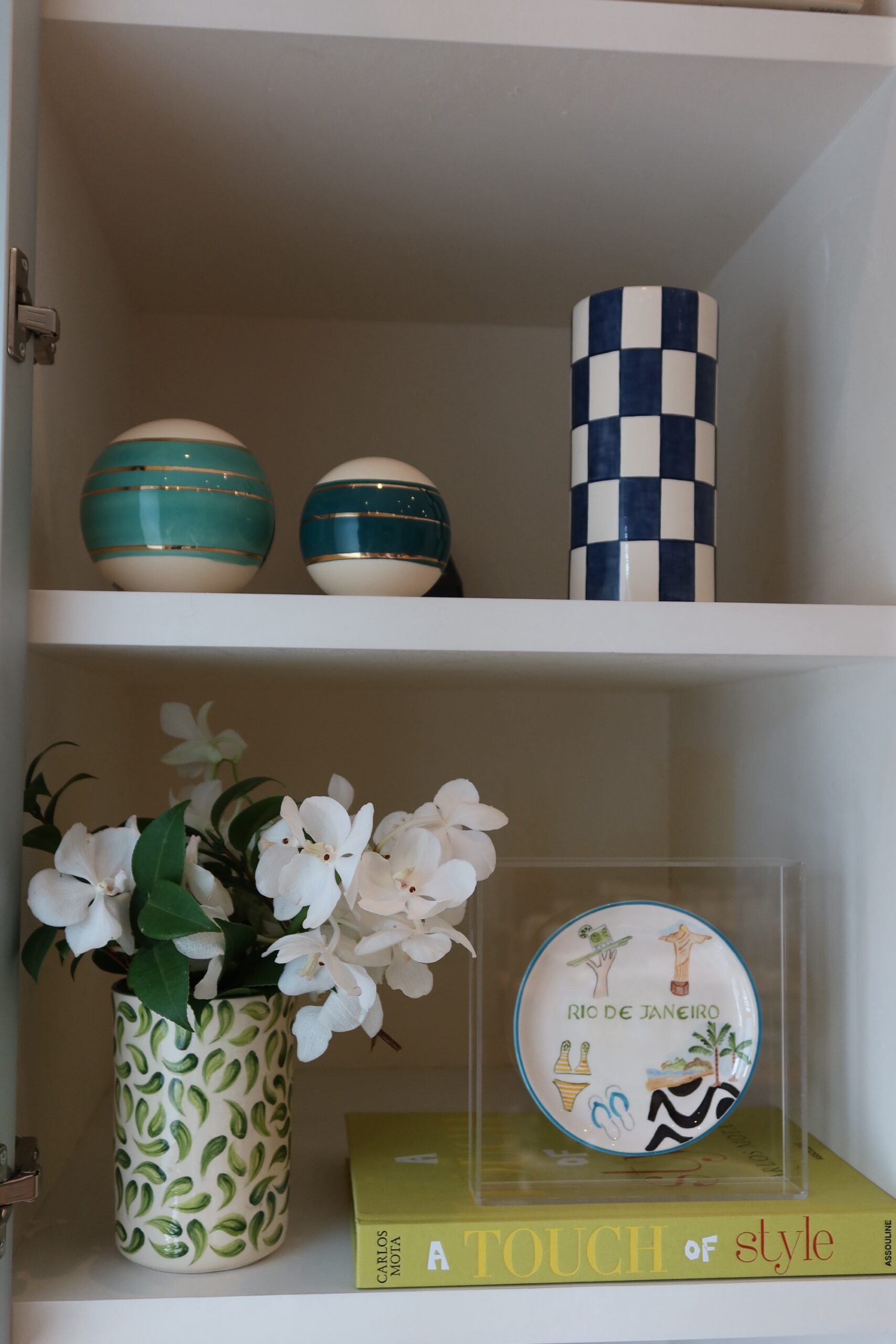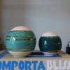 Dupla de bolas em cerâmica, pintadas à mão com detalhes torneados em ouro. A bola média é em petróleo enquanto a pequena é verde água, trazendo assimetria e um design moderno à decor!