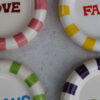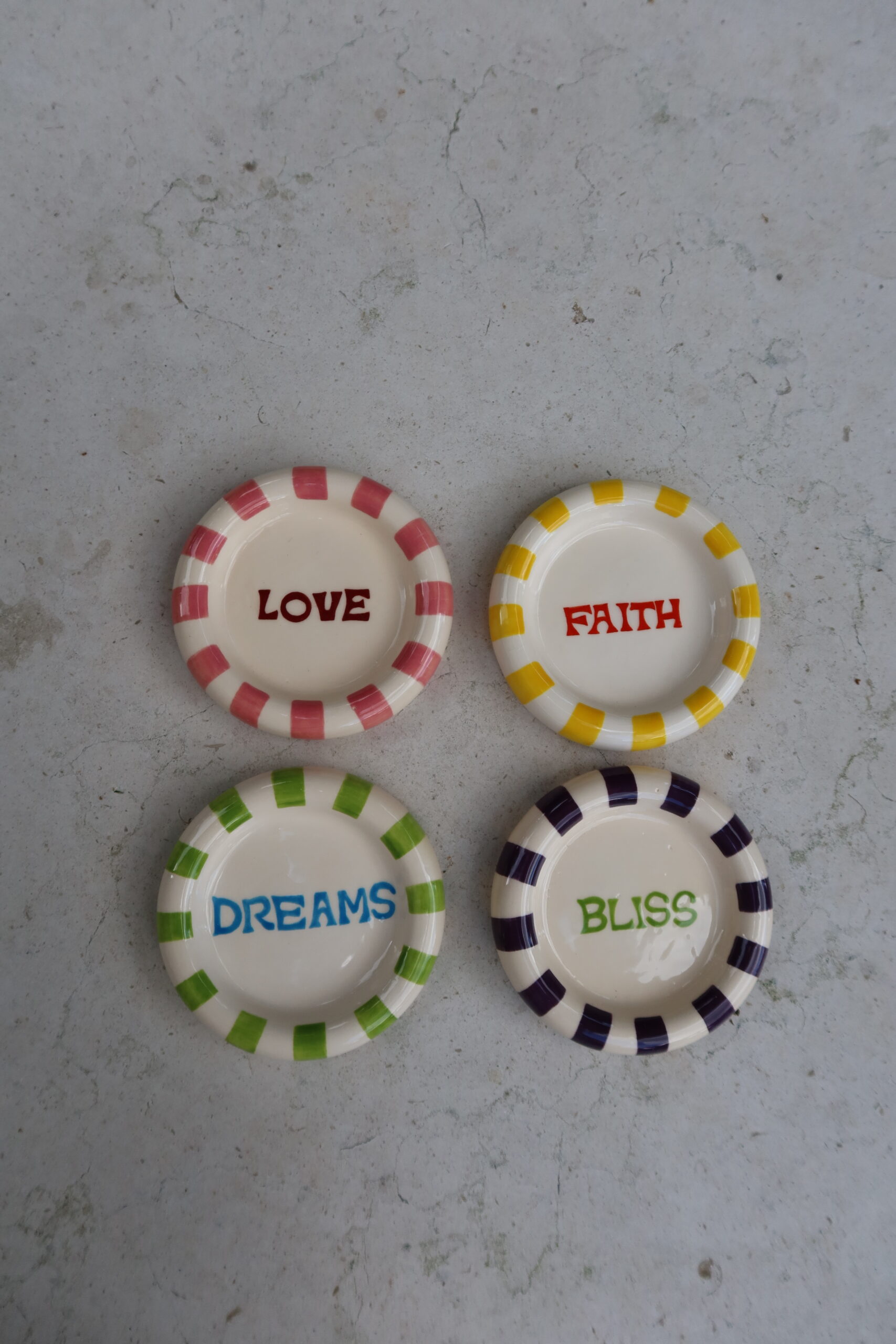 Esses porta-copos de cerâmica chegam em versões coloridas e divertidas, cada um com uma palavra diferente sobre desejos.