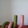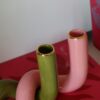 Dupla de vasos torçidos que se entrelaçam e transmitem um design único. Em oliva & pink, com a boca torneada em ouro, essa peça pode ser utilizada com ou sem arranjo floral.