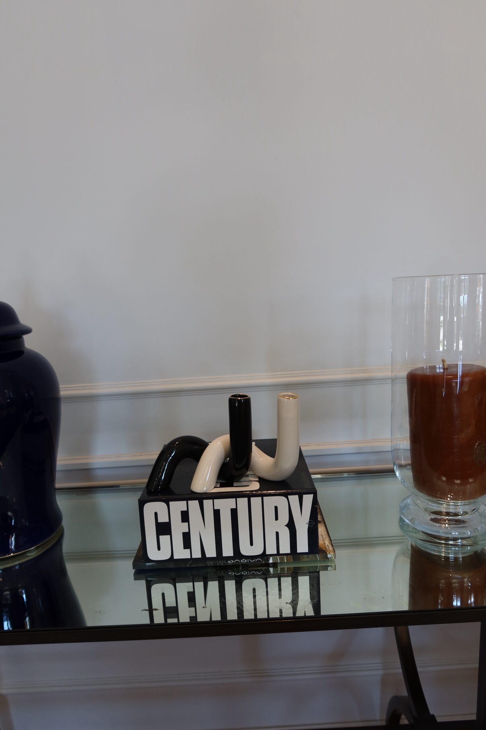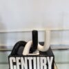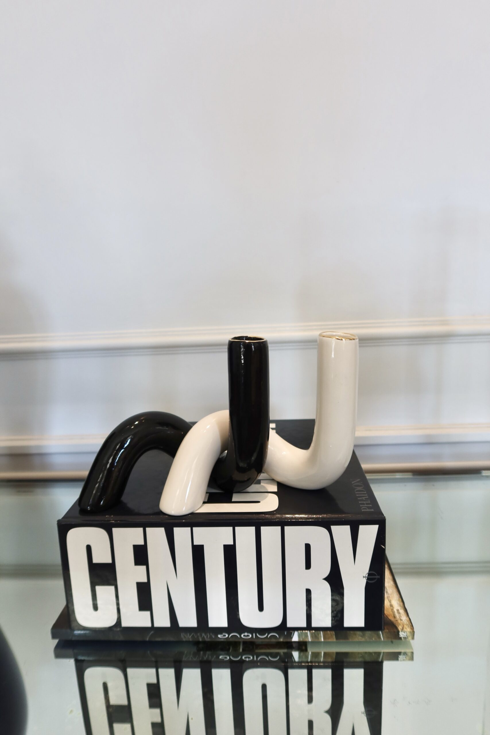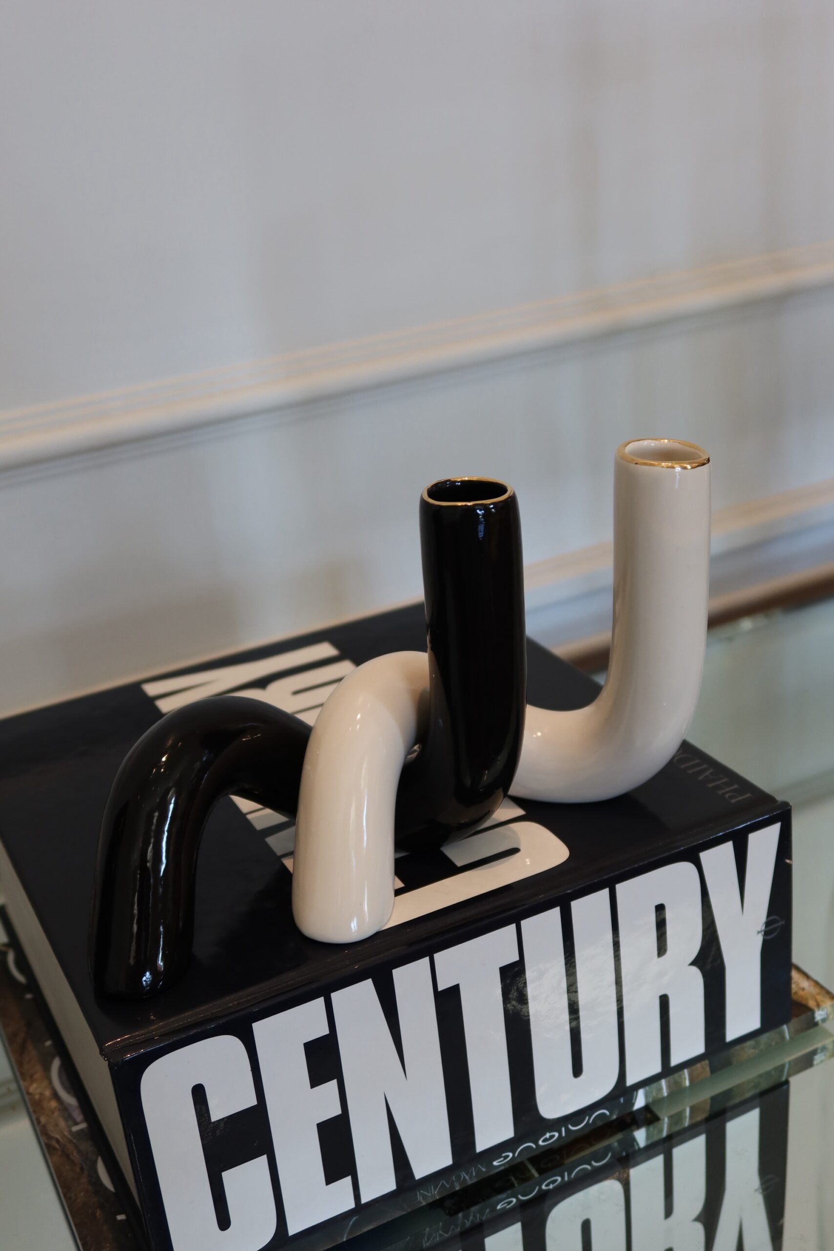 Dupla de vasos torçidos que se entrelaçam e transmitem um design único. Em preto e branco, com a boca torneada em ouro, essa peça pode ser utilizada com ou sem arranjo floral.